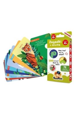 Obrazkowa książeczka porusza wszechstronną tematykę bliską przedszkolakom: zwierzęta, kosmos, dinozaury, ciekawe zawody Zagadki mają formę rymowanych wierszyków. Fragmenty ilustrowanych odpowiedzi (albo zmyłki!) widoczne są przez specjalne dziurki. Odpowiedziom towarzyszą tematyczne zadania lub ciekawostki. W poręcznej książeczce na śrubie znajdziecie 76 zagadek i ciekawostek.