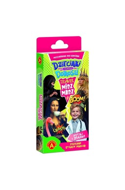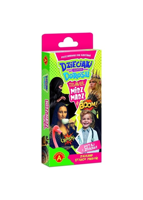 "Dzieciaki Kontra Dorośli Misz Masz Travel" to gra planszowa, która zapewni świetną zabawę całej rodzinie. Dzieci rywalizują z dorosłymi, odpowiadając na podchwytliwe pytania. Dzięki dwóm oddzielnym zestawom kart z pytaniami o innym poziomie trudności dedykowanym dzieciom oraz rodzicom, szanse na wygraną są takie same dla obu drużyn.