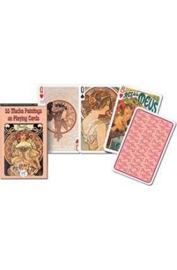 Najwyższej jakości karty do gry renomowanej firmy Ferd. Piatnik & Sohne. Idealne zarówno do brydża, pokera, remika jak i innych gier. Karty z oryginalnymi awersami (twarzami) - na 54 kartach najwspanialsze dzieła czeskiego grafika i malarza Alfonsa Muchy. Talia składa się z 55 plastikowanych kart o wymiarach 58 x 89 mm i gramaturze 310. Wyroby wiedeńskiej fabryki Ferd. Piatnik & Sohne od 1824 roku urzekają bogactwem wzorów i perfekcją wykonania. Jakość i tradycja!
