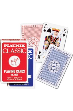Klasyczne, wysokiej jakości karty do gry renomowanej firmy Ferd. Piatnik & Sohne. Talia składa się z 55 plastikowanych kart o wymiarach 58 x 89 mm i gramaturze 310. Idealna zarówno do brydża, pokera, remika jak i innych gier. Wyroby wiedeńskiej fabryki Ferd. Piatnik & Sohne od 1824 roku urzekają bogactwem wzorów i perfekcją wykonania. Jakość i tradycja!